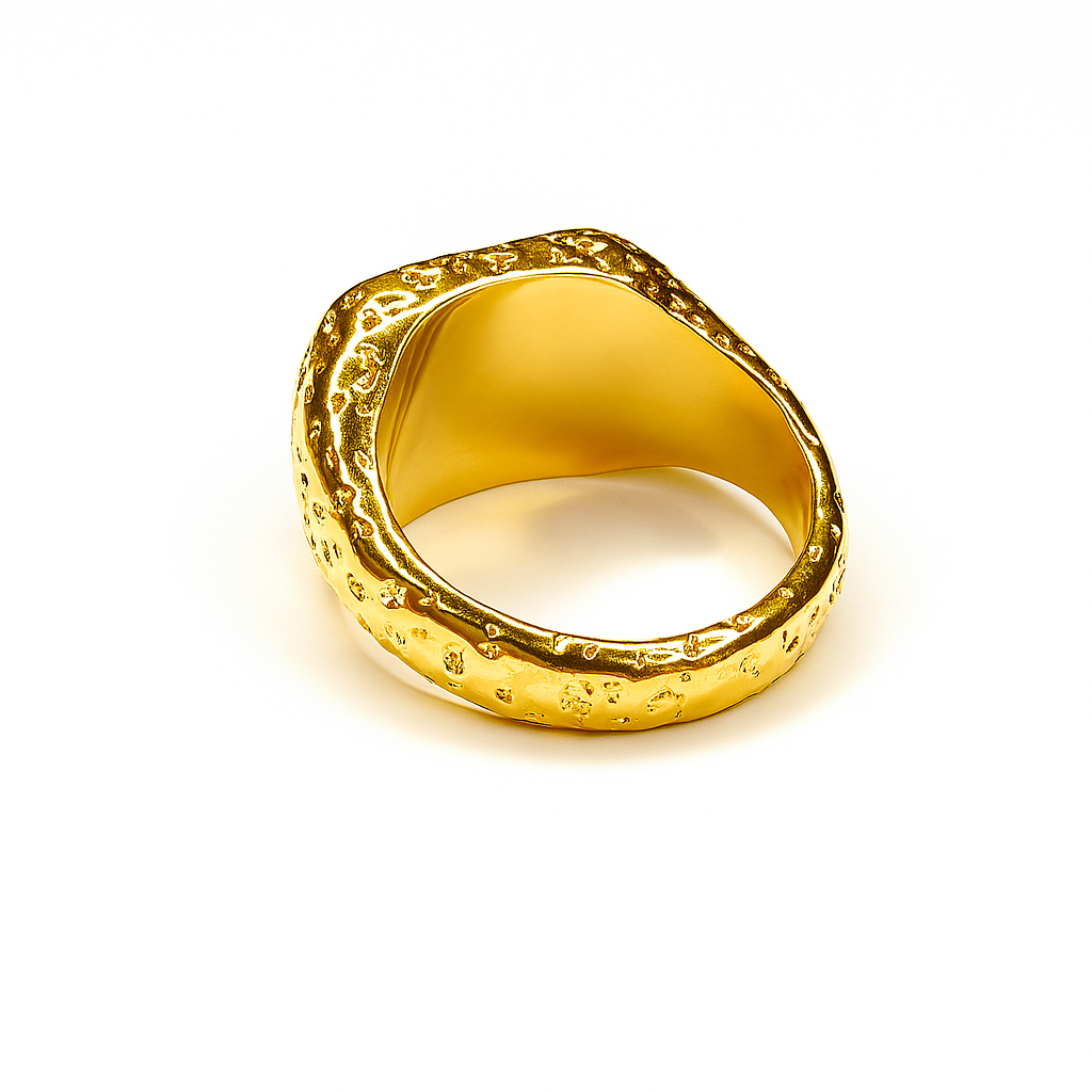 La bague Amélie réinvente la chevalière avec une touche brute mais délicate, plaquée d’un or 18K éclatant. Son fini martelé reflète la lumière comme un métal en mouvement, sublimé par une pierre blanche décentrée — un secret rien que pour vous. Audacieuse, sculptée et légèrement rebelle, elle s’adresse à celles qui embrassent un style unique avec assurance.