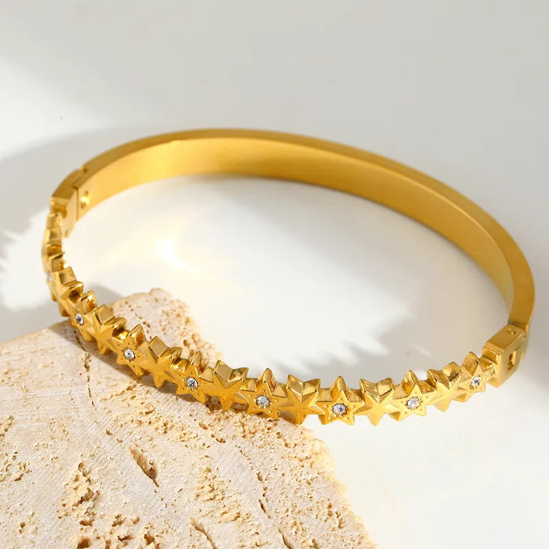 Le jonc Roxane révèle une constellation de petites étoiles délicatement serties, créant un éclat raffiné qui illumine le poignet à chaque mouvement. Sa silhouette rigide et épurée lui confère une allure élégante et intemporelle. Une pièce lumineuse et pleine de caractère, pensée pour sublimer votre style d’une touche céleste et féminine.
