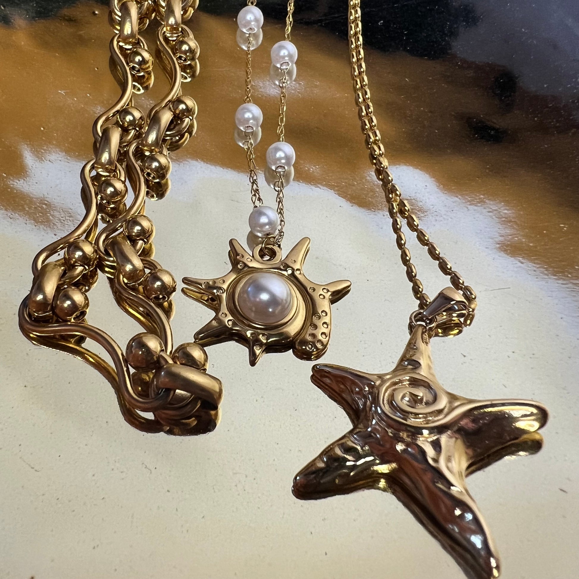 Le collier Lena met en lumière un pendentif étoile de mer martelé, symbole de force et de renouveau. Porté sur une fine chaîne dorée, il allie éclat solaire et esprit marin. Audacieux et élégant, c’est le bijou idéal pour celles qui aiment affirmer leur singularité avec une touche poétique.