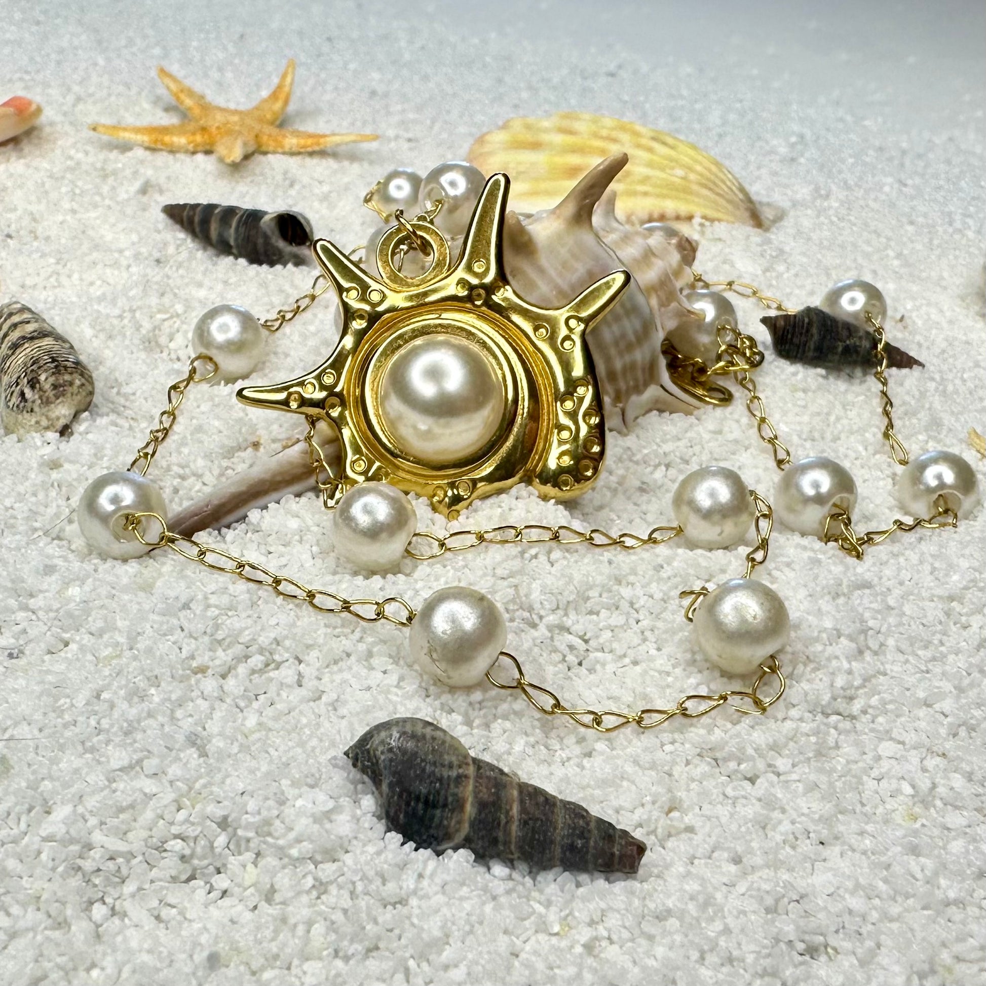 Sofia porte l’esprit de l’océan tout près de votre cœur. Une chaîne ornée de perles soutient un pendentif saisissant en forme de coquillage surmonté d’une perle lumineuse. Audacieux et envoûtant.
